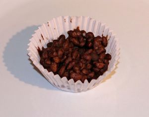 I made some Rice Krispie chocolate snacks using supermarket brand crispies that were too awful to eat as cereal. I used 3 ounces of them (100gm) with a 100gm bar of supermarket dark chocolate, 2 oz of butter and 3 tablespoons of golden syrup.