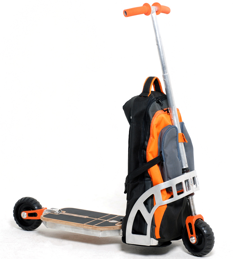 It’s a clever idea from Brazil-based designer Gustavo Brenck, although this is not yet in production, but developed as a DIY designer project. The concept of his ‘Gig pack’ is clever: you need a backpack to keep your stuff in, so why not make one that doubles as a scooter? It’s made of aluminium, with the rear part of the scooter folded into the nylon backpack, and the handlebars, upright and front wheel sitting snugly outside the back of it. You unzip the pack, fasten front and back wheels and secure the straps. Your goodies are safely retained in the backpack that now rides behind the front of the scooter. It will carry up to 90 kilos, and has big rubber wheels to give it a comfortable ride. It solves the problem of how to get around the traffic, and yet be able to take it into an office, shop or a coffee bar when you need to leave the pavement. It won’t get stolen while it’s on your back, and is easily carried onto a train, tube or bus if you need to. It’s clever, it does the job, and it looks awesomely cool…